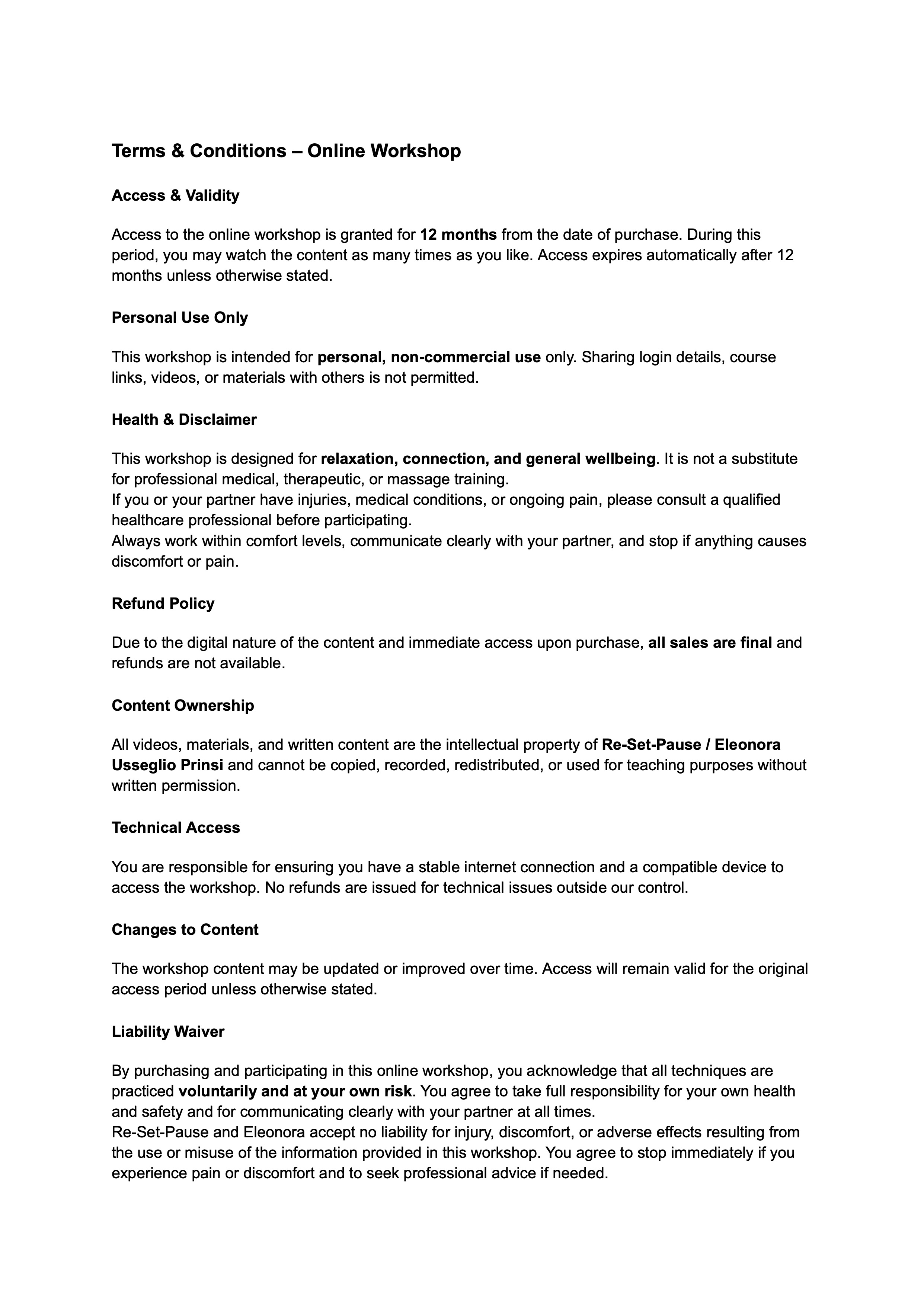 This workshop focuses on relaxation and general wellbeing. Therefore, if you or your partner have injuries, medical conditions, or ongoing pain, consult a qualified healthcare professional before starting. Throughout the workshop, continually listen to your body, work within your comfort level, and pause or stop any technique that causes discomfort. Additionally, if you feel unsure at any point, feel free to get in touch, I’ll happily suggest which sessions to skip or how to modify techniques so you can stay safe while still enjoying the workshop.